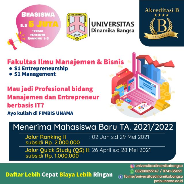 · klik menu pendaftaran > lakukan registrasi · diharap . Daftar perguruan tinggi negeri dan swasta yang berada di provinsi jambi meliputi akademi, politeknik, sekolah tinggi,. S/d sabtu, 28 februari 2021; Periode pendaftaran dimulai sejak tanggal 1 oktober 2020 sampai 16 agustus 2021. Dan jadwal sidang tugas akhir semester genap 2020/2021, bisa dilihat melalui tautan berikut ini :. Di program magister sistem informasi (msi) stikom dinamika bangsa jambi. Penerimaan mahasiswa baru stmik akakom tahun akademik 2021/2022. Info pendaftaran khusus transfer gasal tahun akademik 2020/2021. Ie pratiwi, h yani, b beny. Penerimaan mahasiswa baru stmik akakom tahun akademik 2021/2022. Entry krs dan perwalian semester genap 2020/2021 dilaksanakan pada tanggal 6 februari 2021 s/d 21 februari 2021. Bagian pendaftaran mahasiswa baru universitas dinamika lt.1.